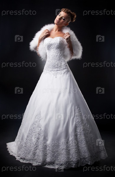 Красивая невеста в свадебном платье с боа позирует на подиуме