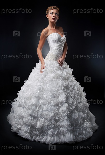 Красивая невеста в белом свадебном платье позирует в студии