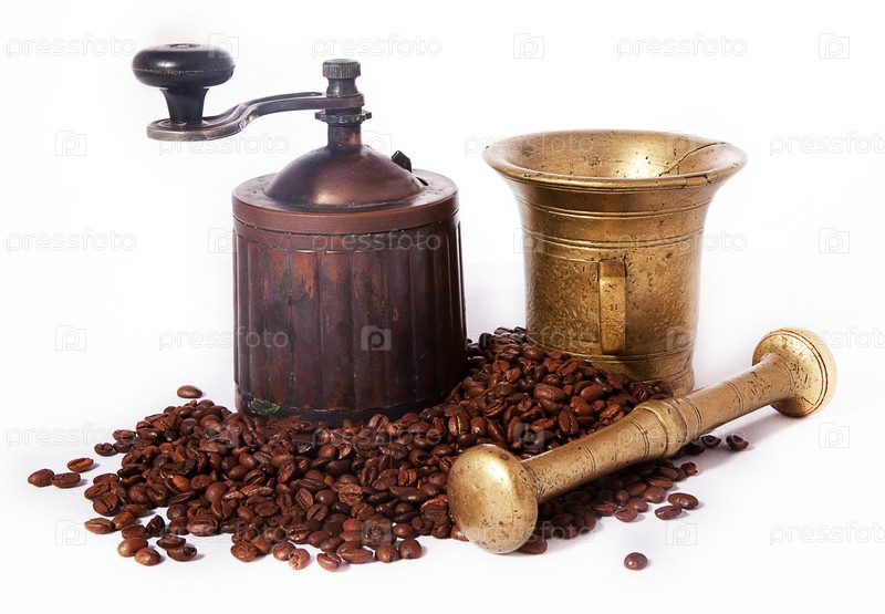 Старомодная медная кофемолка и горсть кофейных зерен