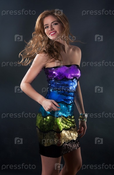 Радостная красивая девушка танцует в ярком модном платье
