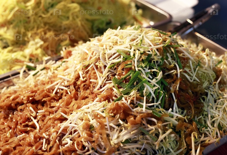 Лапша с зеленым луком на прилавке магазина