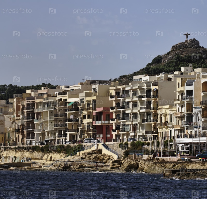 Здание на берегу моря и статуя Иисуса на холме, город Марсалфорн, остров Гозо, Мальта
