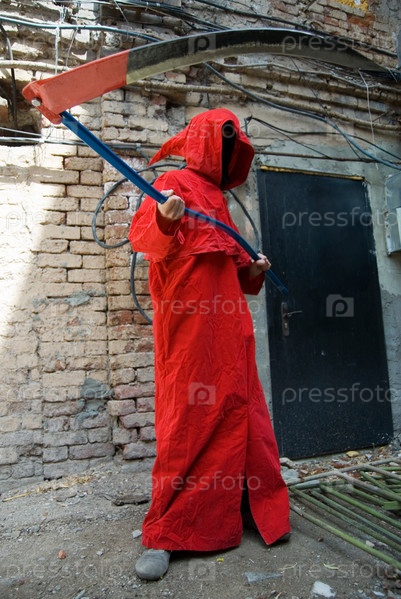 Человек в красном плаще с капюшоном и косой