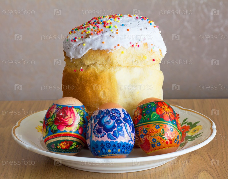 Пасхальный кулич и три яйца на тарелке