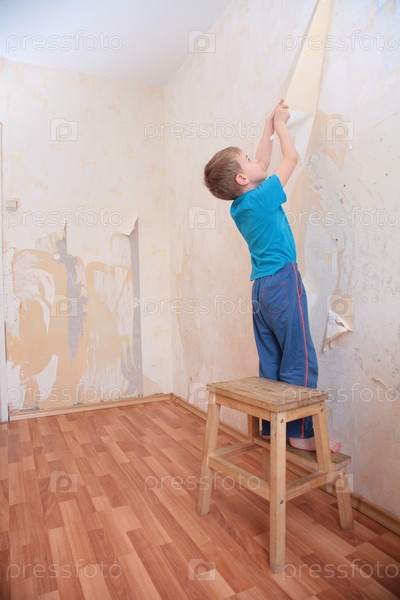 Мальчик отрывает обои от стены