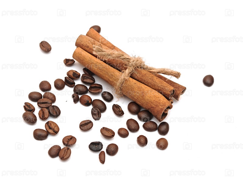 Ароматный кофе в зернах с корицей на белом фоне