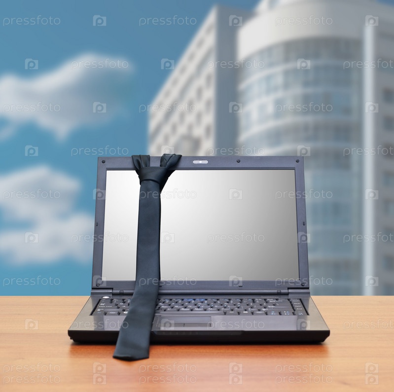 Ноутбук с галстуком на фоне здания