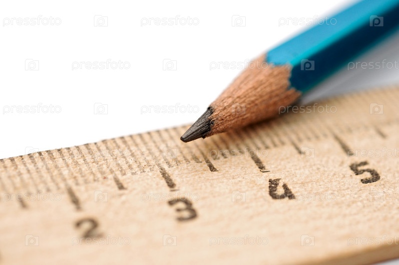 Линейка и деревянный карандаш крупным планом на белом фоне