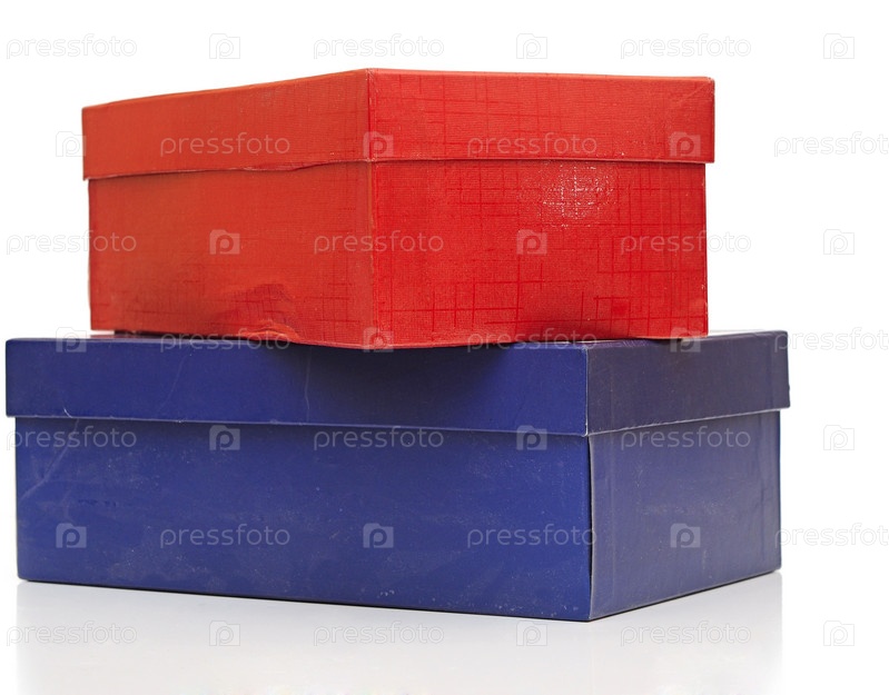 Старые синяя и красная подарочные коробки на белом фоне