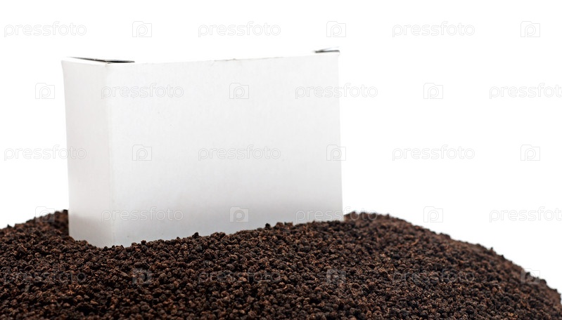 Пустая белая коробка на фоне черного чая