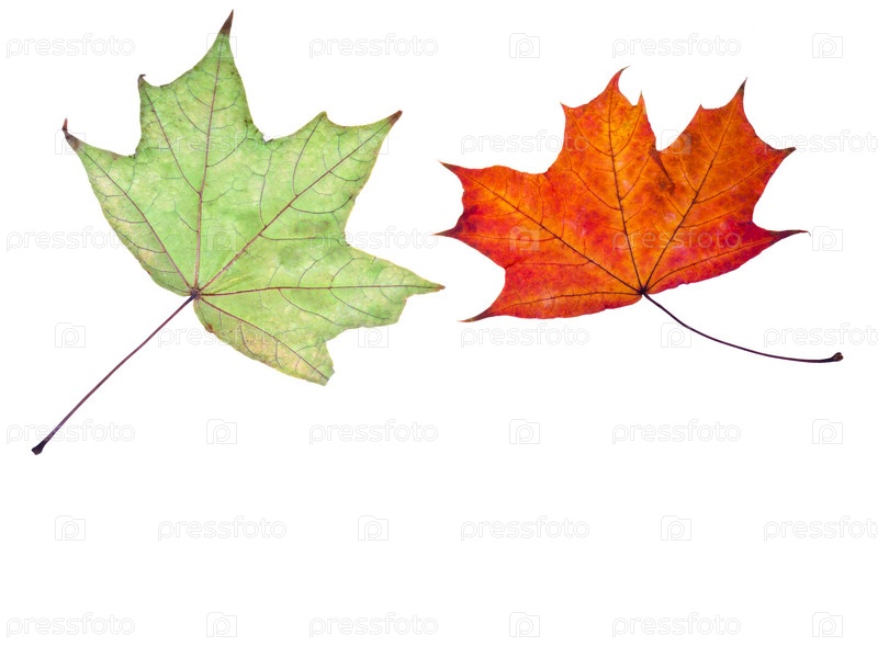 Два кленовых осенних листа зеленого и красного цвета