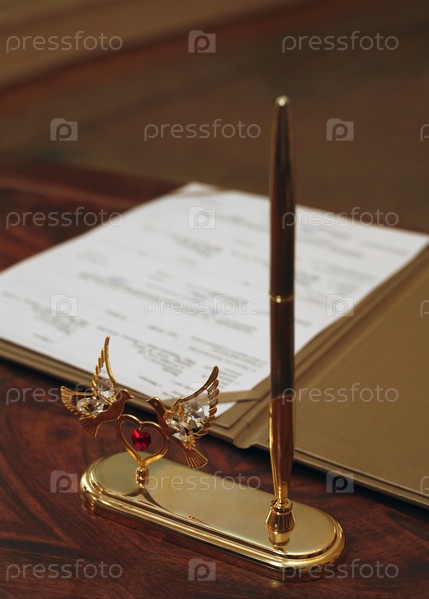 Свадебный контракт с ручкой на деревянном столе