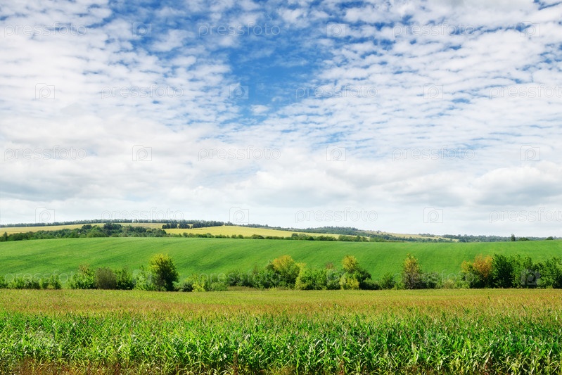 Зеленое поле и небо с легкими облаками
