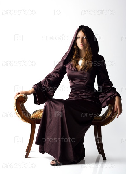 Красивая девушка в длинном платье сидит в студии