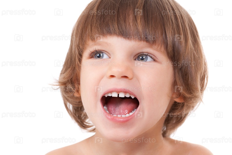 Студийный портрет девочки с открытым от радости ртом крупным планом