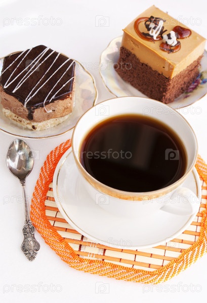 Чашка утреннего черного кофе и сладкие бисквитные пирожные