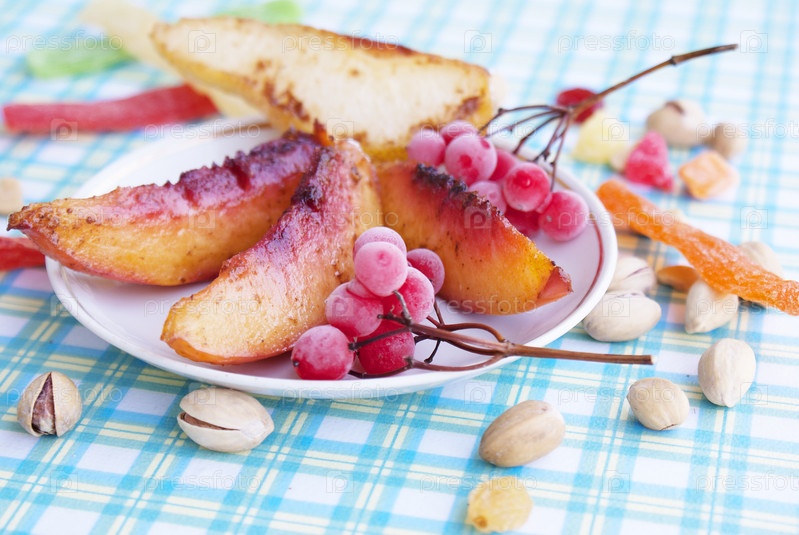 Жареные дольки персика и груши с орешками и ягодами калины с мороза