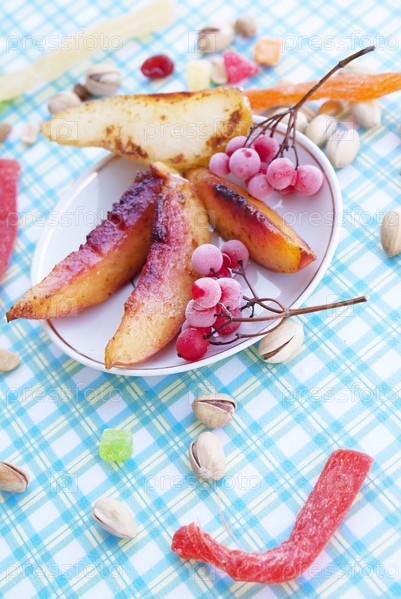 Жареные дольки персика и груши с орешками и ягодами калины с мороза