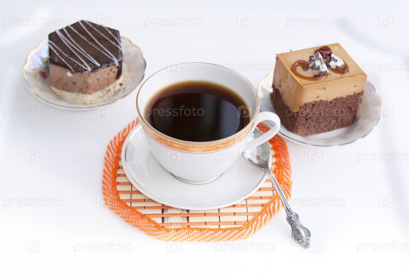 Чашка утреннего черного кофе и сладкие бисквитные пирожные