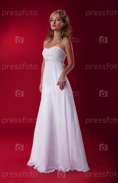 Чувственная блондинка позирует в свадебном платье на подиуме