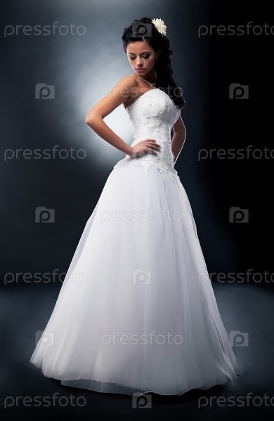Красивая темноволосая модель в белом свадебном платье на подиуме