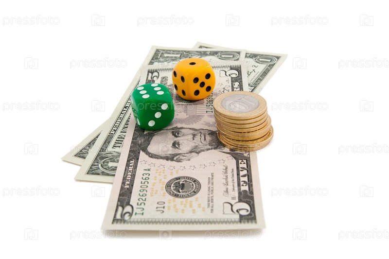 Игральные кости и деньги на белом фоне