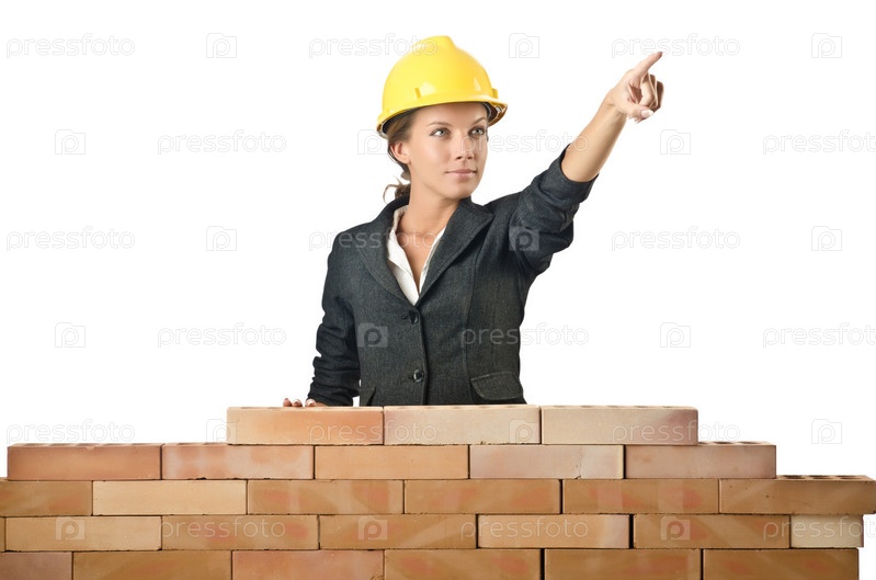 Молодая женщина-строитель у кирпичной стены