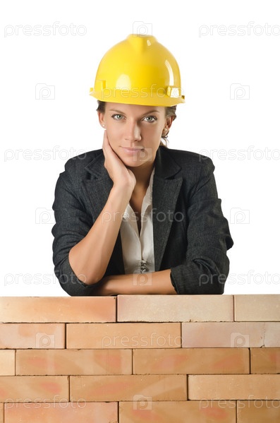 Молодая женщина-строитель у кирпичной стены