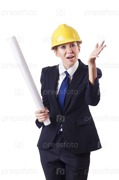 Архитектор-женщина с рисунками на белом фоне