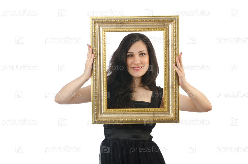 Женщина с фоторамками на белом фоне