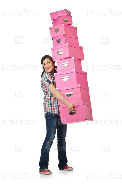 Девушка со стопкой коробок на белом фоне