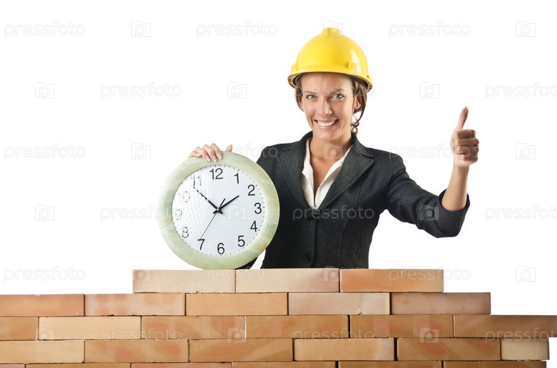 Женщина-строитель и часы на белом фоне