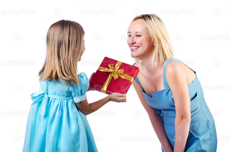 Счастливая мама и дочь на белом фоне
