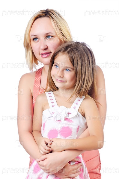 Счастливая мама и дочь на белом фоне
