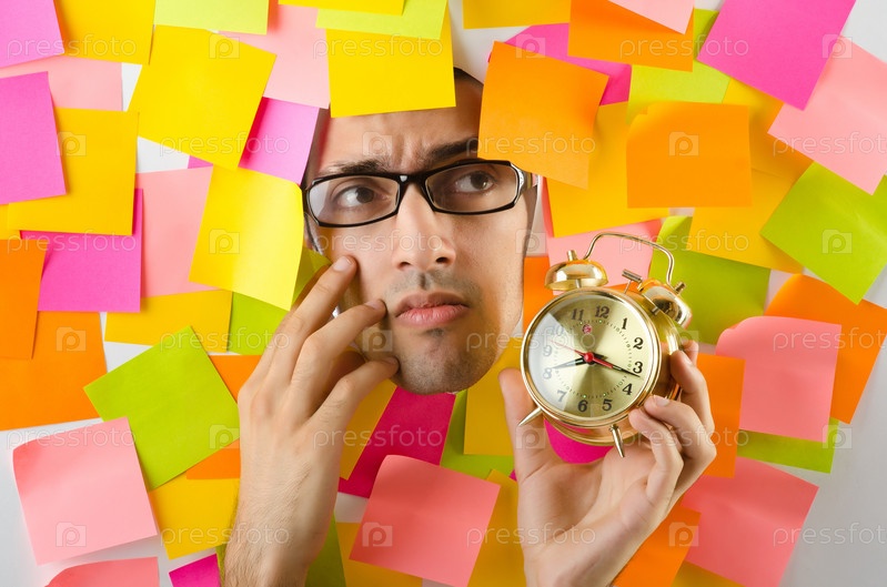 Лицо человека со стикерами и будильником