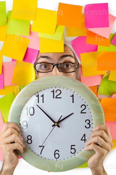 Лицо человека со стикерами и будильником