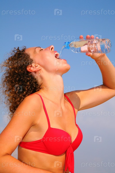 Девушка в красном купальнике пьет воду