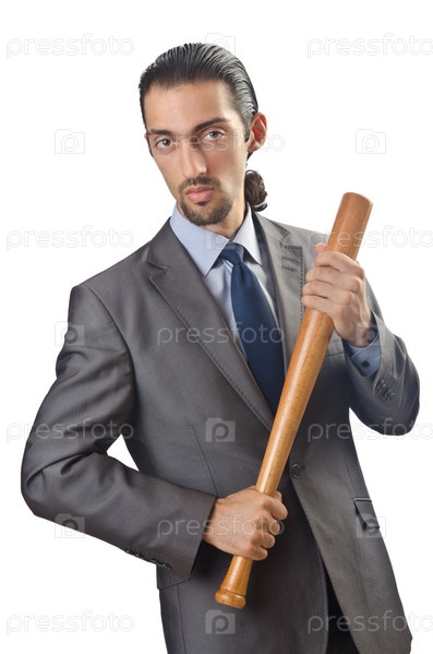 Сердитый бизнесмен с битой на белом фоне