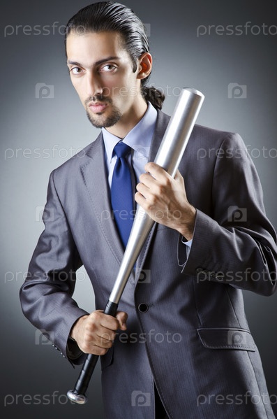 Сердитый бизнесмен с битой на белом фоне