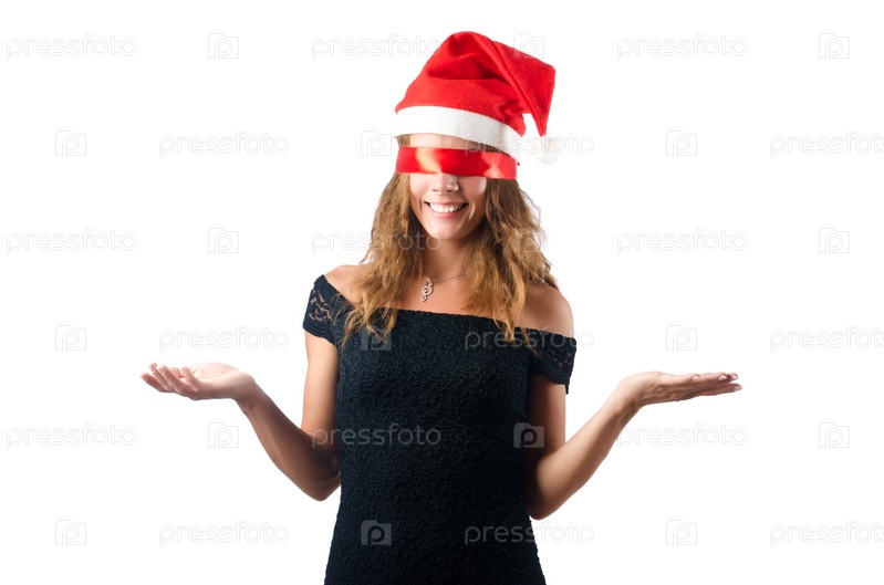 Молодая женщина в колпаке Санта-Клауса на белом фоне