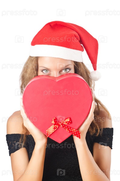Молодая женщина в колпаке Санта-Клауса с подарком на белом фоне