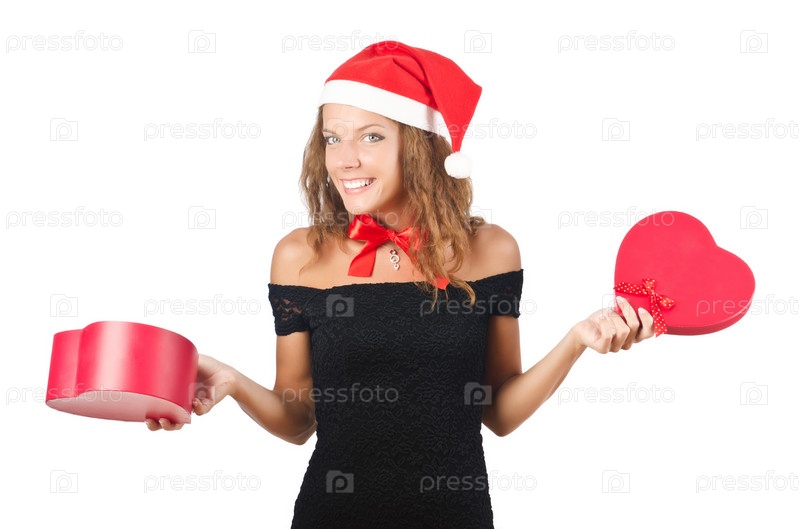Молодая женщина в колпаке Санта-Клауса с подарками на белом фоне