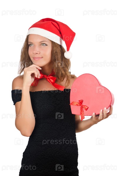 Молодая женщина в колпаке Санта-Клауса с подарком на белом фоне