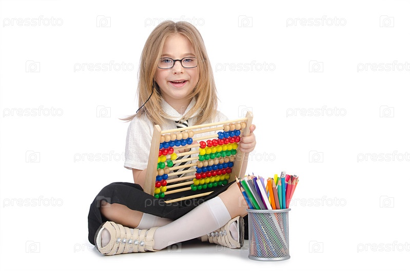Маленькая девочка со счетами на белом фоне