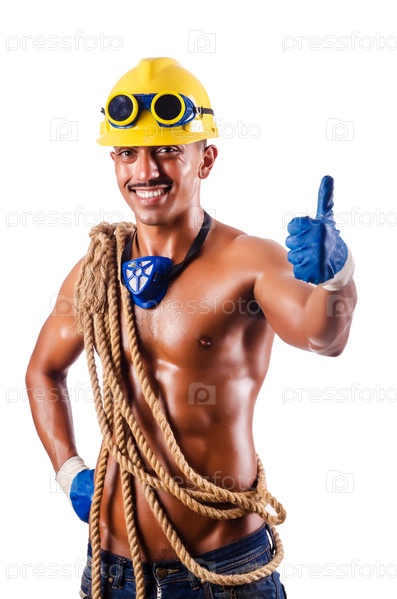 Мускулистый строитель с инструментами, изолированный на белом фоне