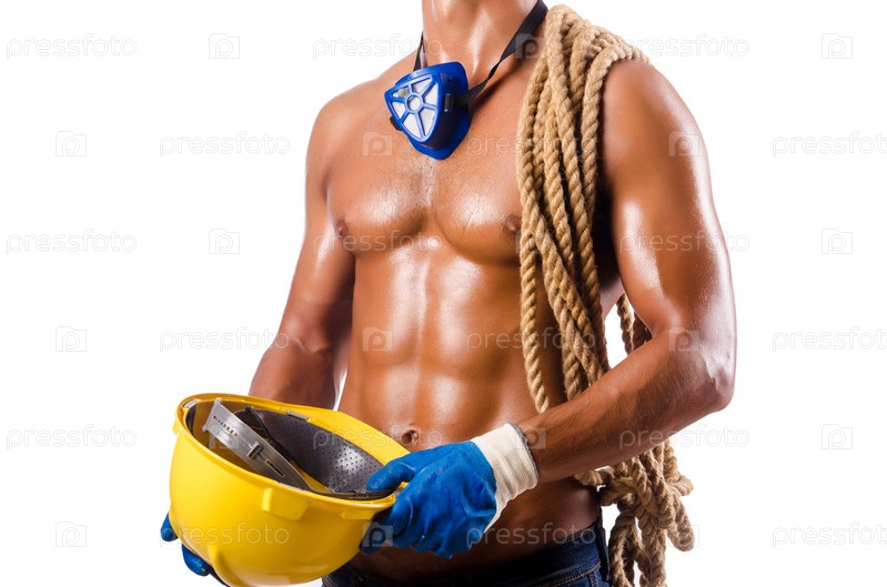 Мускулистый строитель с инструментами, изолированный на белом фоне
