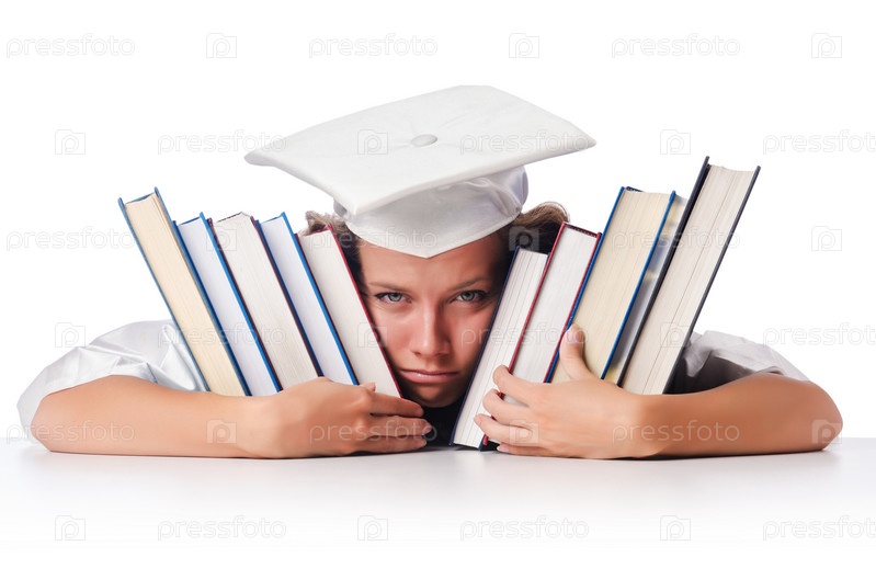 Выпускник с большим количеством книг на белом фоне