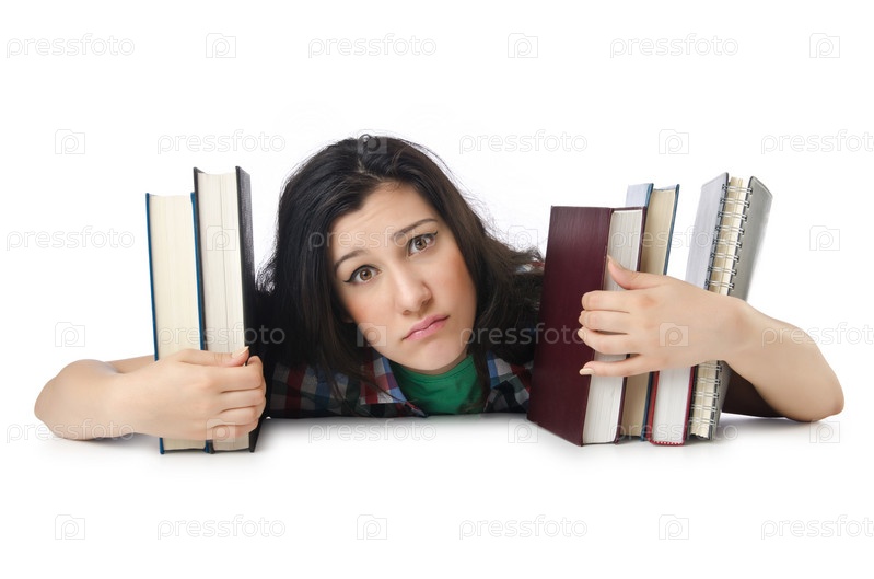 Усталая студентка с учебниками на белом фоне