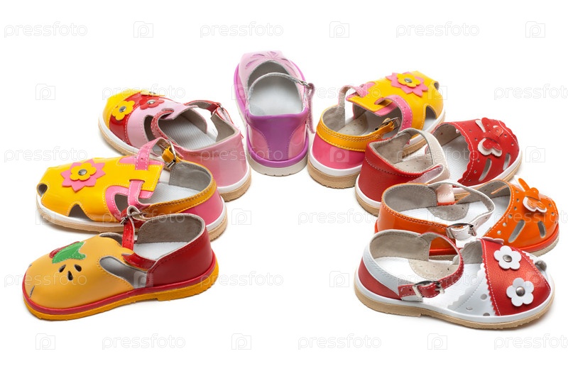 Детские сандалии стоят полукругом на белом фоне