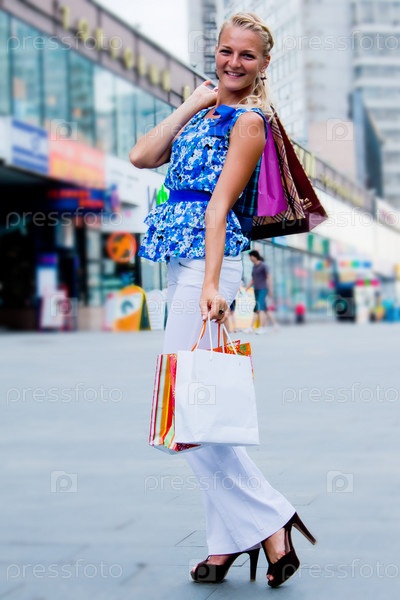 Красивая девушка гуляет по улице с покупками в пакетах